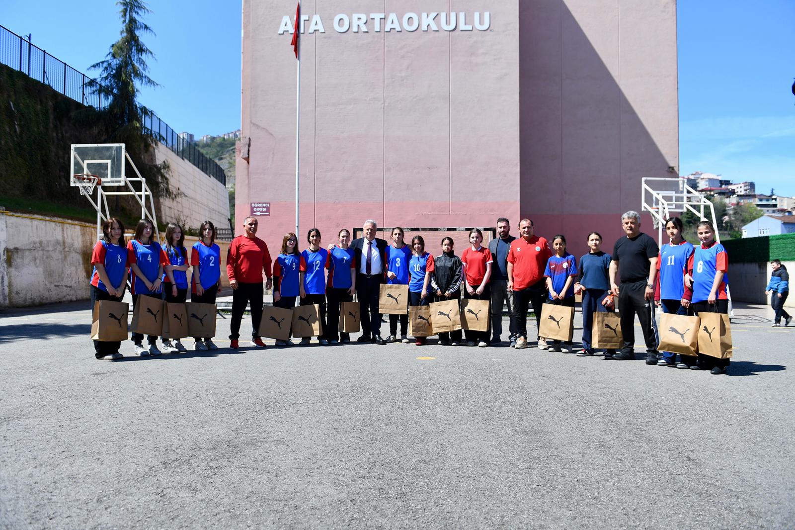 Trabzon Haber Merkezi | Trabzon’da 16 yıldır şampiyon olan Ata Ortaokulu Küçük Kızlar Futsal Takımı, Ortahisar Belediyesi’nden malzeme desteği aldı.