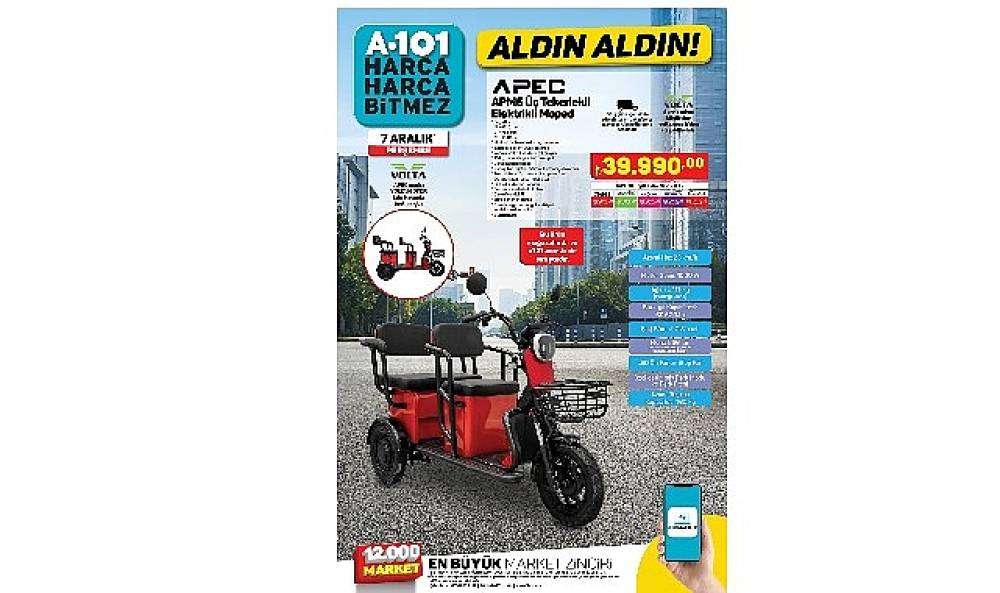 7 Aralık günü a101.com.tr’de ve A101 mağazalarında APEC APM5 Üç Tekerlekli Elektrikli Moped tüketicilere sunuluyor. 39.990 TL fiyatlı bu ürün, Euro 5 standardında bulunuyor ve B sınıfı veya herhangi bir ehliyet sınıfı ile kullanılabiliyor.