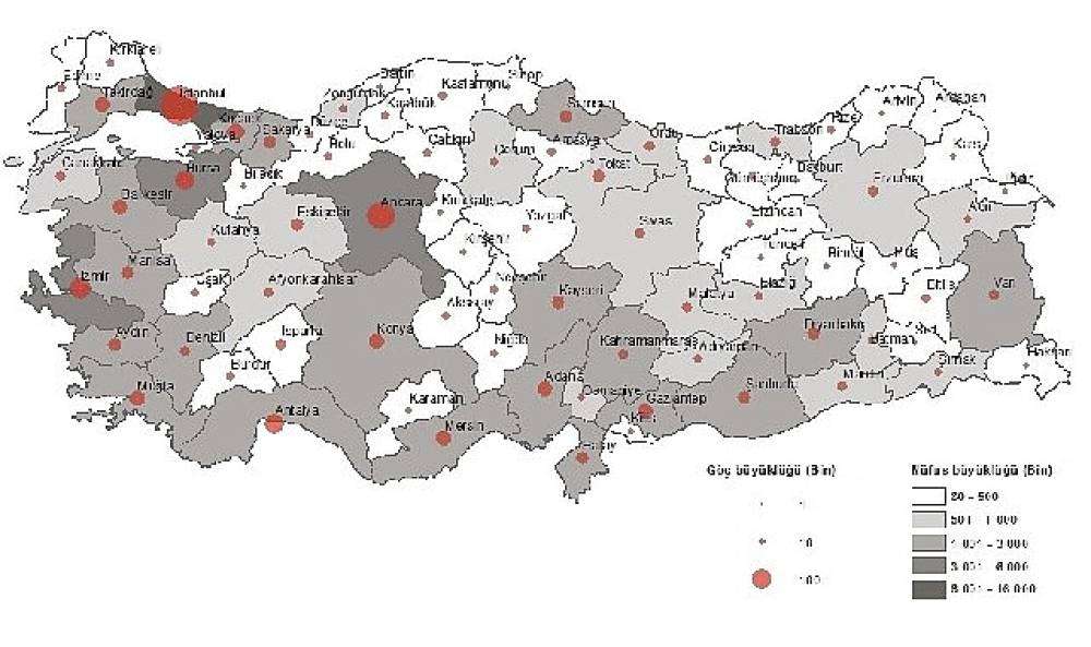 Türkiye'de iller arası göç eden nüfusun dağılımına bakıldığında, İstanbul, 385 bin 328 kişi ile en çok göç alan il oldu. İstanbul'u sırasıyla 197 bin 702 kişi ile Ankara ve 131 bin 394 kişi ile İzmir takip etti.  En az göç alan iller ise sırasıyla 4 bin 750 kişi ile Ardahan, 7 bin 54 kişi ile Tunceli ve 7 bin 474 kişi ile Kilis oldu.