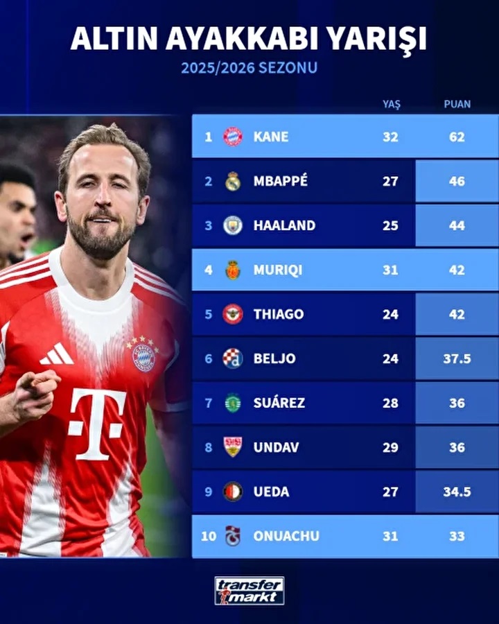 Transfermarkt verilerine göre İngiliz yıldız Harry Kane, 31 gol ve 62 puanla listenin ilk sırasında bulunuyor. Kane’i Real Madrid forması giyen Kylian Mbappe 23 gol ve 46 puanla takip ederken, Manchester City’nin Norveçli golcüsü Erling Haaland ise 22 gol ve 44 puanla üçüncü sırada yer alıyor.
