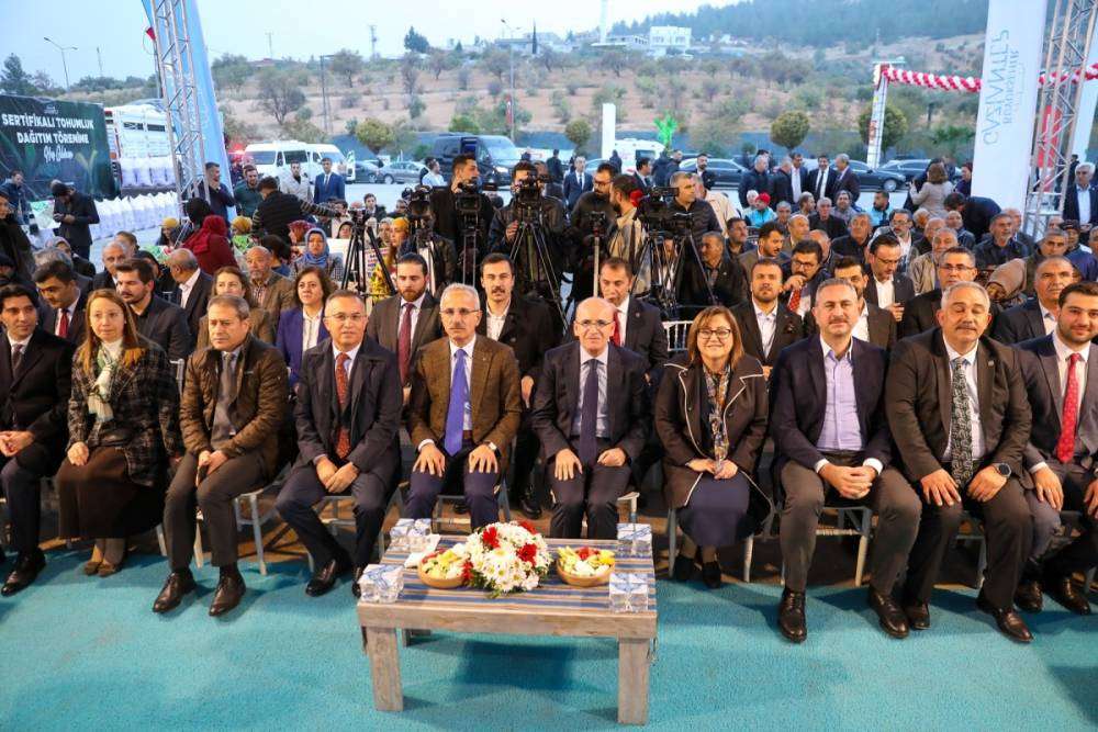 Dağıtım töreninde Hazine ve Maliye Bakanı Mehmet Şimşek ile Ulaştırma ve Altyapı Bakanı Abdülkadir Uraloğlu’nun yanı sıra Gaziantep Büyükşehir Belediye Başkanı Fatma Şahin, Gaziantep Valisi Kemal Çeber, AK Parti Gaziantep milletvekilleri, ilçe belediye başkanları, il protokolü ve çiftçiler bulundu.