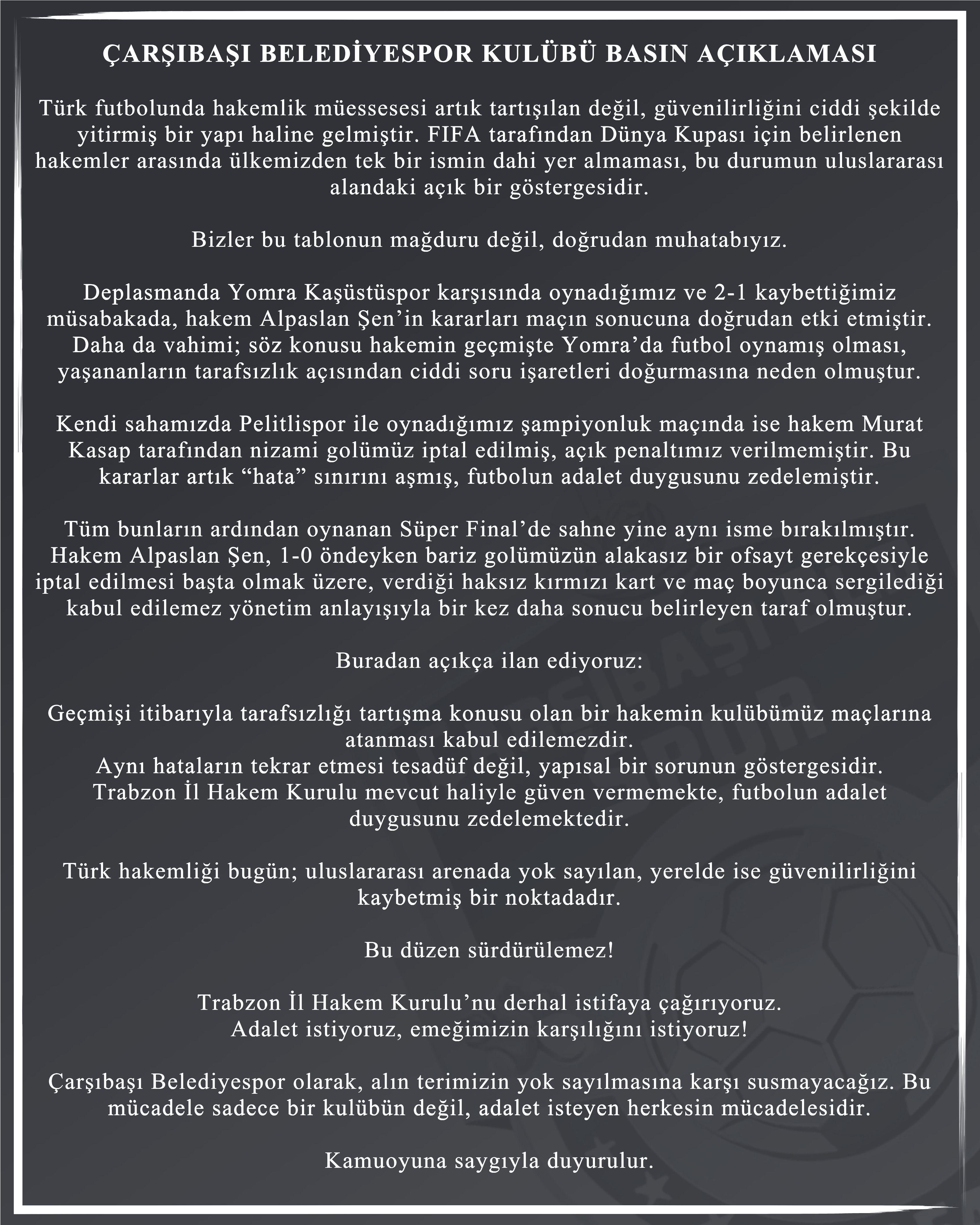 Trabzon Haber Merkezi | Çarşıbaşı Belediyespor, son maçlarda yaşanan hakem kararlarına tepki göstererek Trabzon İl Hakem Kurulu’nun istifasını talep etti.