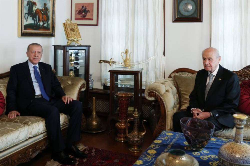 Cumhur İttifakı ortağı Bahçeli'nin Türkmenbeyi Caddesi'ndeki evinde gerçekleşen görüşme İletişim Başkanlığı'ndan aktarılan bilgiye göre yaklaşık 1 saat sürdü.