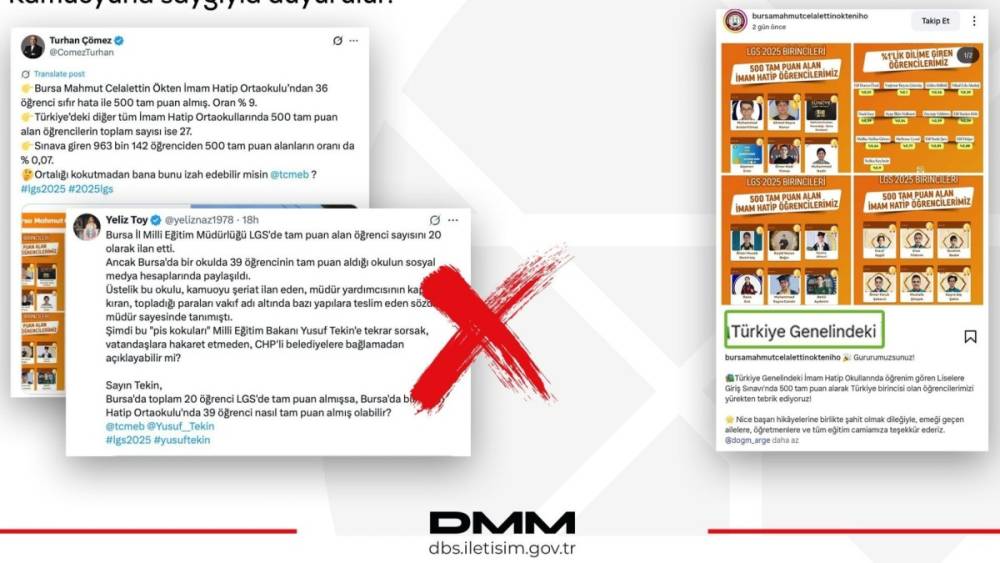 “Bursa il genelinde 17 farklı okuldan toplam 20 öğrenci 2025 LGS’de 500 tam puan almıştır. Bu öğrencilerin yalnızca 2’si imam hatip ortaokulu mezunudur. Dolayısıyla söz konusu okuldan 36 ya da 39 öğrencinin 500 tam puan aldığı yönündeki iddia tamamen asılsızdır.”
