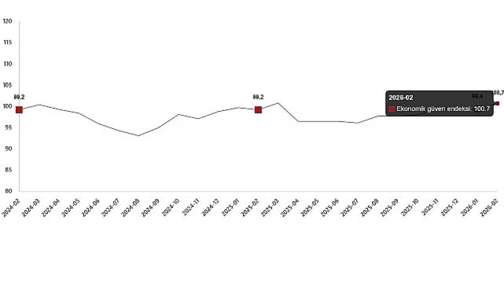 Ekonomik güven endeksi 100,7 oldu Ekonomik güven endeksi Ocak ayında 99,4 iken, Şubat ayında %1,4 oranında artarak 100,7 değerini aldı. Bir önceki aya göre Şubat ayında tüketici güven endeksi %2,3 oranında artarak 85,7 değerini, reel kesim (imalat sanayi) güven endeksi %1,1 oranında artarak 104,1 değerini, hizmet sektörü güven endeksi aynı düzeyde kalarak 113,8 değerini, perakende ticaret sektörü güven endeksi %2,9 oranında artarak 115,9 değerini, inşaat sektörü güven endeksi %2,1 oranında azalarak 83,9 değerini aldı. Ekonomik güven endeksi, Şubat 2026 Ekonomik güven endeksi, güven endeksleri ve değişim oranları, Şubat 2026   Endeks Bir önceki aya göre değişim oranı (%)   Ocak Şubat Ocak Şubat Ekonomik güven endeksi 99,4 100,7 0,0 1,4 Tüketici güven endeksi 83,7 85,7 0,3 2,3 Reel kesim güven endeksi 103,0 104,1 -0,7 1,1 Hizmet sektörü güven endeksi 113,8 113,8 1,3 0,0 Perakende ticaret sektörü güven endeksi 112,6 115,9 -2,4 2,9 İnşaat sektörü güven endeksi 85,7 83,9 1,5 -2,1 Endeks değerleri mevsim etkilerinden arındırılmış değerlerdir. Tüketici güven endeksinde mevsim etkisi bulunmamaktadır.   Kaynak: (BYZHA) Beyaz Haber Ajansı