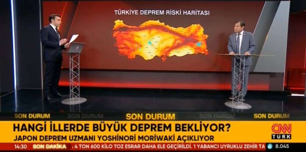 CNN TÜRK canlı yayınında Kaan Temeltaş'ın sorularını yanıtlayan Japon Deprem Uzmanı Yoshinori Moriwaki hangi illerde büyük deprem bekliyor?: 4 tane var. Birinci; Doğu Anadolu fay hattı, Elazığ, Maraş'tan Hatay'a. Türkiye her zaman domino taşı gibi. Kuzey Anadolu fay hattı da böyle. Doğu Anadolu fay hattı da aynı. O zaman bu Hatay'da sonra Suriye tarafında. Öbürü, Kıbrıs tarafına gidiyor, deniz tarafı içinde. Denizin içinde deprem oluyorsa tsunami oluyor. Küçük depremler oluyorsa 1 metre, büyük depremler oluyorsa 3 metre diye söyleyebilirim. Deprem bittikten sonra biraz yukarıya gideceksiniz.