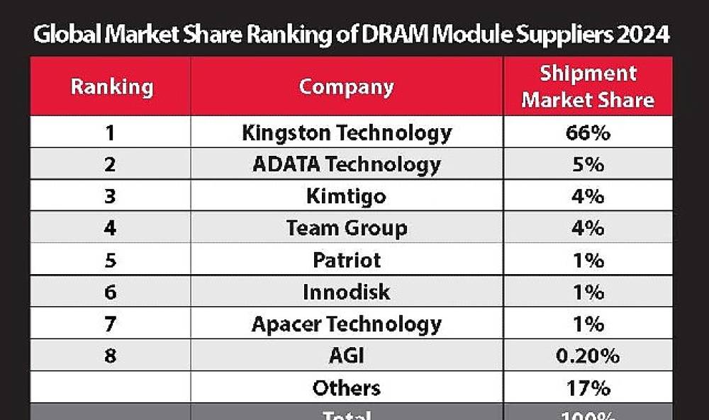 Bellek ürünleri ve teknoloji çözümlerinde dünya lideri Kingston Technology,TrendForce'un gelir bazında yaptığı son sıralamaya göre dünyanın en iyi üçüncü parti DRAM modülü tedarikçisi olduğunu duyurdu. Kingston, yaklaşık %66 pazar payıyla sektördeki 1 numaralı konumunu korumayı sürdürüyor.