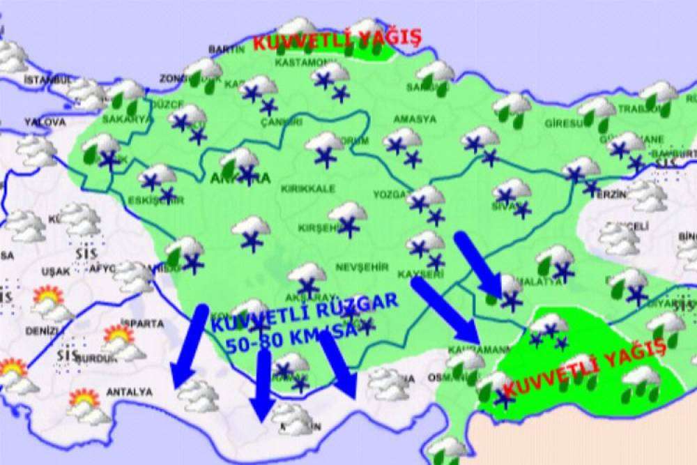 KUVVETLİ YAĞIŞ UYARISI: Yağışların, Güneydoğu Anadolu’nun batısı, Sinop ve Hatay çevreleri ile Kastamonu'nun kıyı, Malatya’nın güney kesimlerinde yer yer kuvvetli olması beklendiğinden ulaşımda aksamlar, buzlanma, tipi gibi olumsuzluklara karşı dikkatli ve tedbirli olunmalıdır.