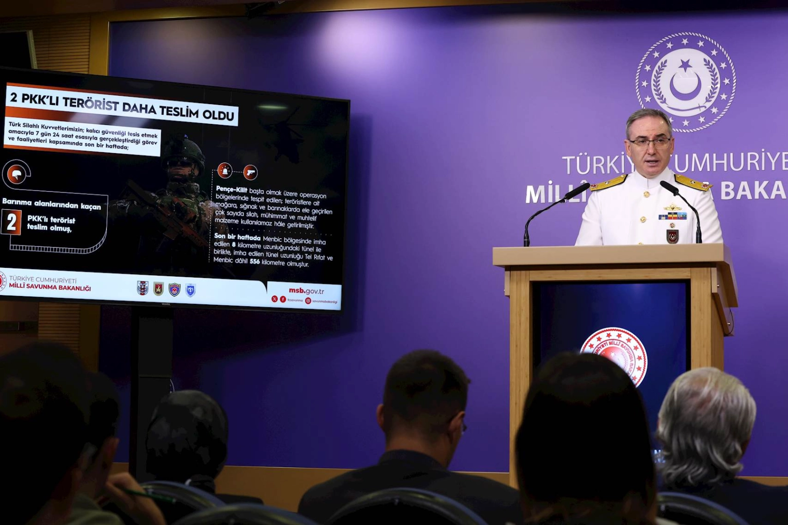 Milli Savunma Bakanlığı, haftalık basın toplantısında, son bir haftada 2 PKK’lı teröristin teslim olduğunu, hudutlarda 395 şahsın yakalandığını ve 166 kilogram uyuşturucu ele geçirildiğini duyurdu. Suriye’de imha edilen tünel uzunluğu ise 556 kilometreye ulaştı.