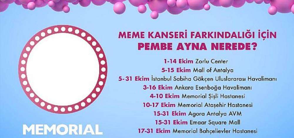 Memorial Sağlık Grubu’nun, 01-31 Ekim Meme Kanseri Farkındalık ayı kapsamında “Ayna Karşısında 5 Dakika” sloganı ile hayata geçirdiği “Pembe Ayna” projesi, bu yıl da toplumsal bilinçlendirme misyonu ile etkinliklerine hız kesmeden devam ediyor. Her kadının meme kanseri farkındalığı için ayna karşısında kendisini muayene ederek memede var olan bir kitleyi erken evrede fark edebilmesine dikkat çeken Pembe Ayna, 1 Ekim’de Zorlu Center’da gerçekleştirilen Memorial Pembe Farkındalık Festivali’nde katılımcılar ile buluştu.    Pembe Ayna projesi, kadınların, 90 oranında kendi kendine muayene ile memedeki bir kitleyi erken evrede belirleme şansını elde etmesi ve bu erken teşhis yönteminden yararlanması adına toplumda bir farkındalık oluşturmayı hedefliyor.    Pembe ayna Türkiye’yi geziyor  Meme kanserinin erken tanısı için herkesin kendisine ayda bir kez, 5 dakika hediye etmesine öncü olan Pembe Ayna; festivalin ardından İstanbul, Ankara ve Antalya’da, toplumsal farkındalık ve sosyal sorumluluk bilincini katılımcılara yansıtmaya devam edecek.    Pembe Farkındalık Festivali’nin lansmanında Zorlu Center’daki yerini alan Pembe Ayna, 1-31 Ekim Meme Kanseri Farkındalık ayı boyunca pek çok adreste olacak:   1 -14 Ekim   Zorlu Center   5-15 Ekim    Mall of Antalya  4- 31 Ekim   İstanbul Sabiha Gökçen Uluslararası Havalimanı 3-16 Ekim    Ankara Esenboğa Havalimanı 4-10 Ekim    Memorial Şişli Hastanesi 10-17 Ekim  Memorial Ataşehir Hastanesi 15-31 Ekim  Agora Antalya AVM 15-31 Ekim  Emaar Square Mall  17-31 Ekim  Memorial Bahçelievler Hastanesi   Meme kanseri için umut halkası oluşturarak ailenize ve sevdiklerinize “Ayna karşısında kendini izledin mi?” diye sormayı unutmayın!    Siz de “Pembe ayna” karşısında fotoğrafınızı çekebilir, sosyal medya hesabınızda paylaşabilir ve meme kanserinde erken teşhisin önemi konusunda farkındalığa katkı sağlayabilirsiniz!