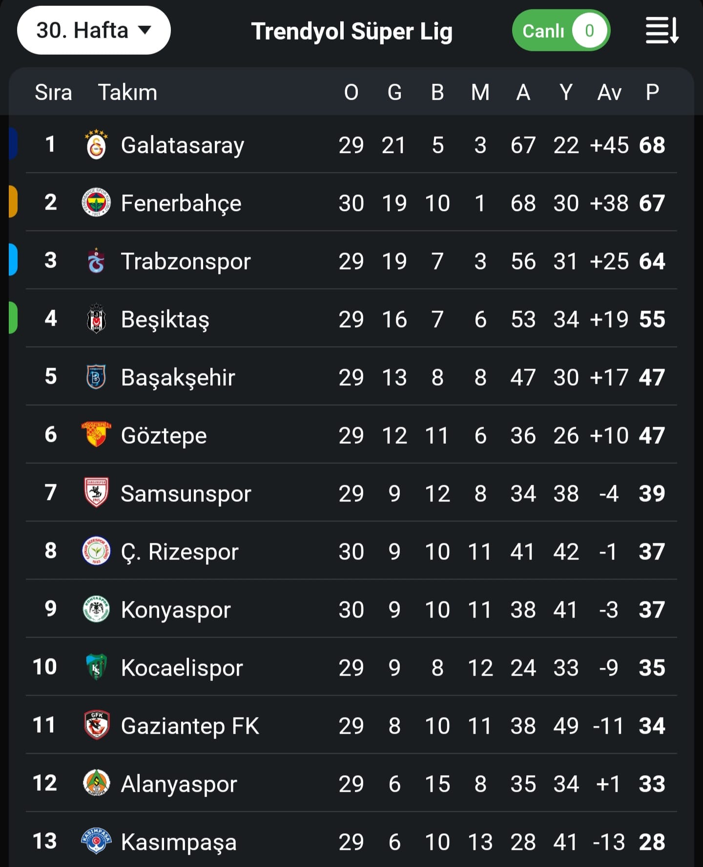 Bu sonucun ardından Fenerbahçe puanını 67’ye yükseltti ancak liderlik koltuğuna oturma fırsatını kaçırdı. Çaykur Rizespor ise hanesine 1 puan ekleyerek 37 puana ulaştı.