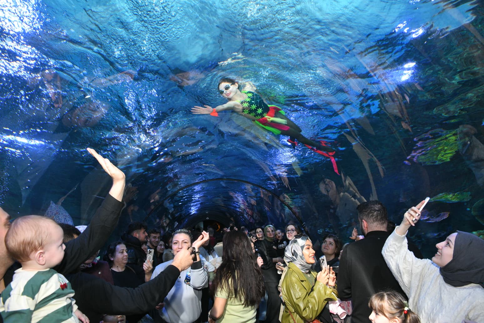 Ziyaretçiler, cep telefonlarıyla gösteriyi kayda alırken özellikle çocuklar büyük heyecan yaşadı. Performans sonunda akvaryum camına yaklaşarak izleyicileri selamlayan sporcu, çocuklarla fotoğraf çektirerek etkinliğe renk kattı.