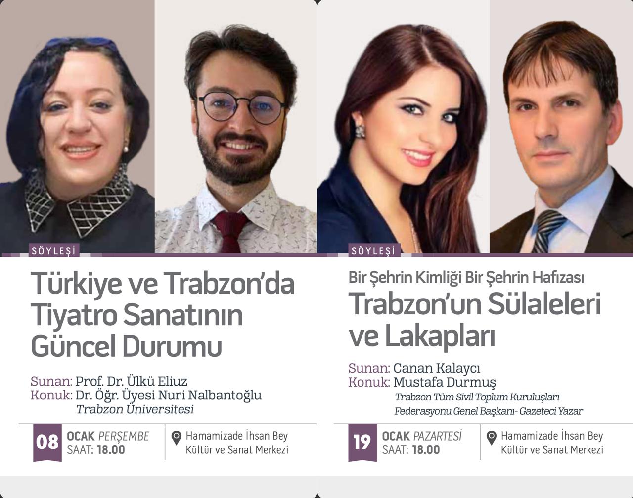 8 Ocak’ta “Türkiye ve Trabzon’da Tiyatro Sanatının Güncel Durumu”, 19 Ocak’ta “Bir Şehrin Kimliği, Bir Şehrin Hafızası: Trabzon’un Sülaleleri ve Lakapları”, 22 Ocak’ta “Milli Değerlerin Toplum Yapısına ve Gençlerin Gelecek Vizyonuna Etkileri” ve 23 Ocak’ta “Fetih ve Sonrası: Osmanlı Şehzadeleri ve Trabzon” başlıklı söyleşiler düzenlenecek.