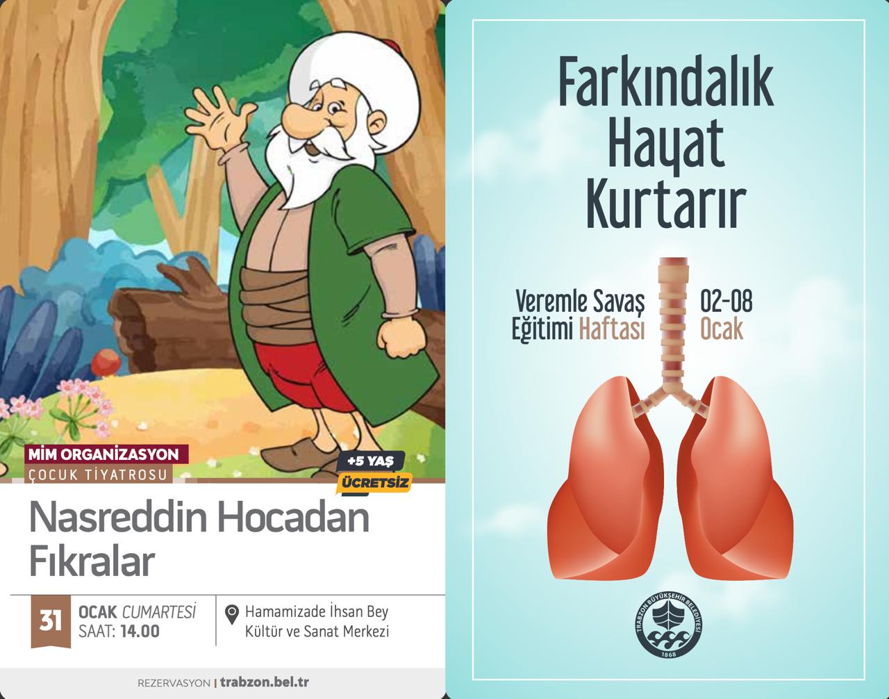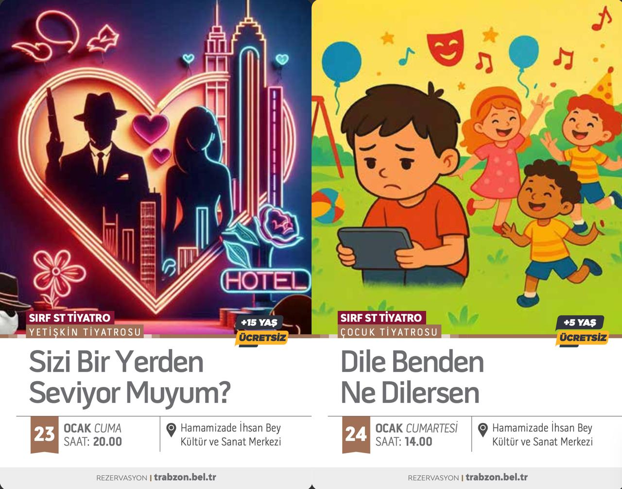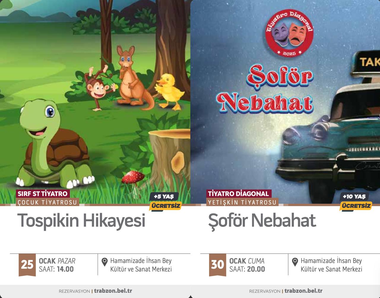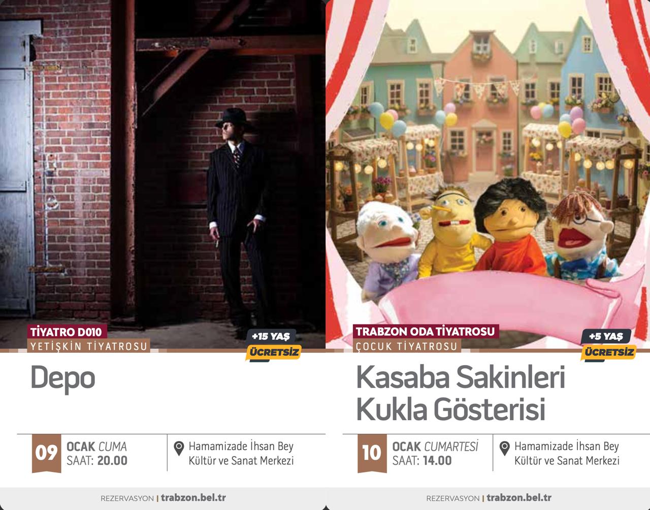 11 Ocak Pazar günü “Çizmeli Kedi” adlı çocuk tiyatrosu minik izleyicilerle buluşurken, 16 Ocak Cuma günü Trabzon Büyükşehir Belediyesi Şehir Tiyatrosu tarafından sahnelenecek “Trabzon’un Kayıp Yılları: Muhacirlik” adlı oyun izleyici karşısına çıkacak.