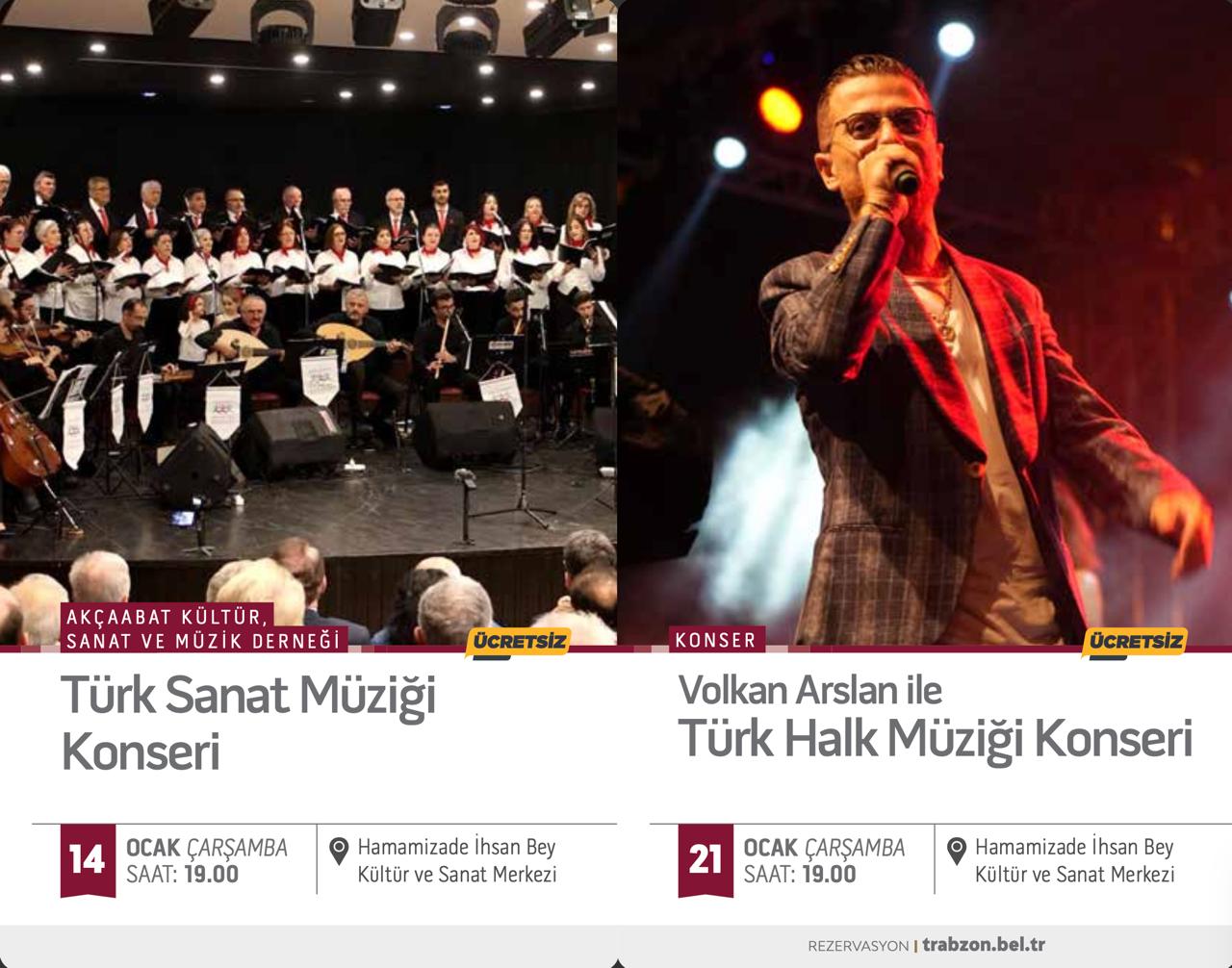 Sanatçı Volkan Arslan’ın vereceği Türk Halk Müziği Konseri ise ayın öne çıkan etkinlikleri arasında yer alacak. Ayrıca 15 Ocak’ta karikatürist Tamer Küçük’ün “Karadeniz İncelemeleri 2” sergisi ile 21 Ocak’ta KTÜ TMYO El Sanatları Bölümü Dokuma Tablo Sergisi sanatseverlerin ziyaretine açılacak.