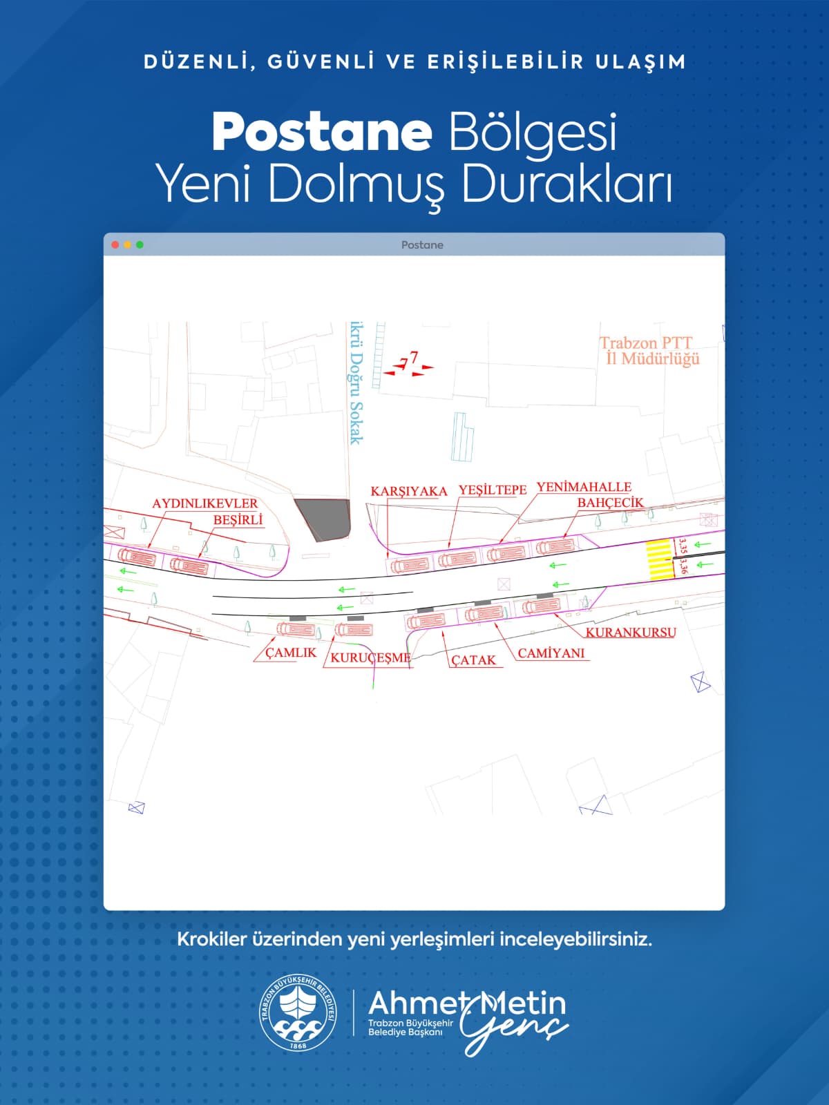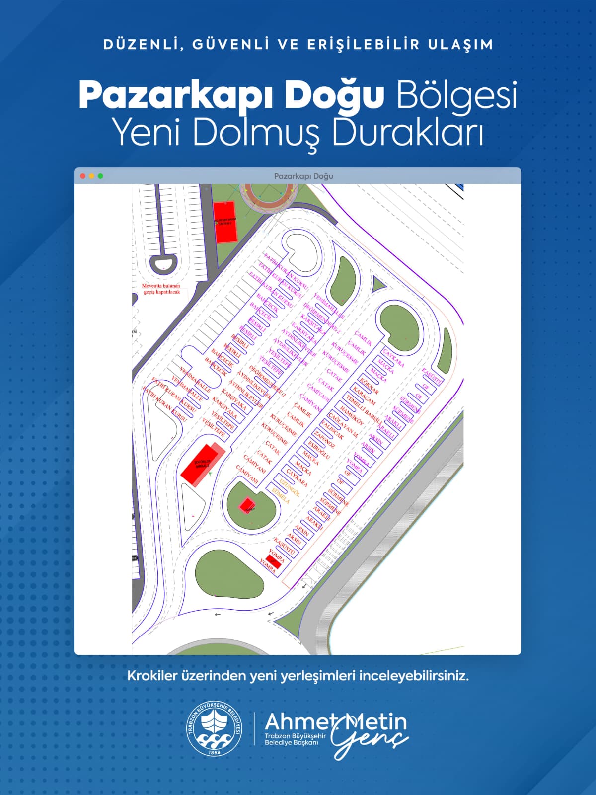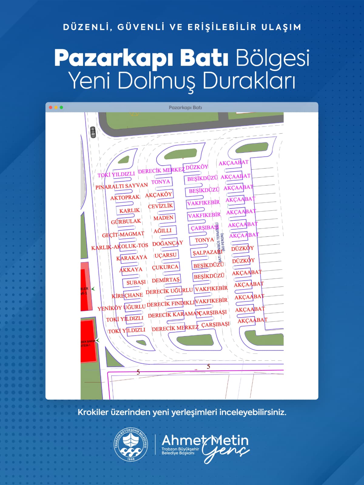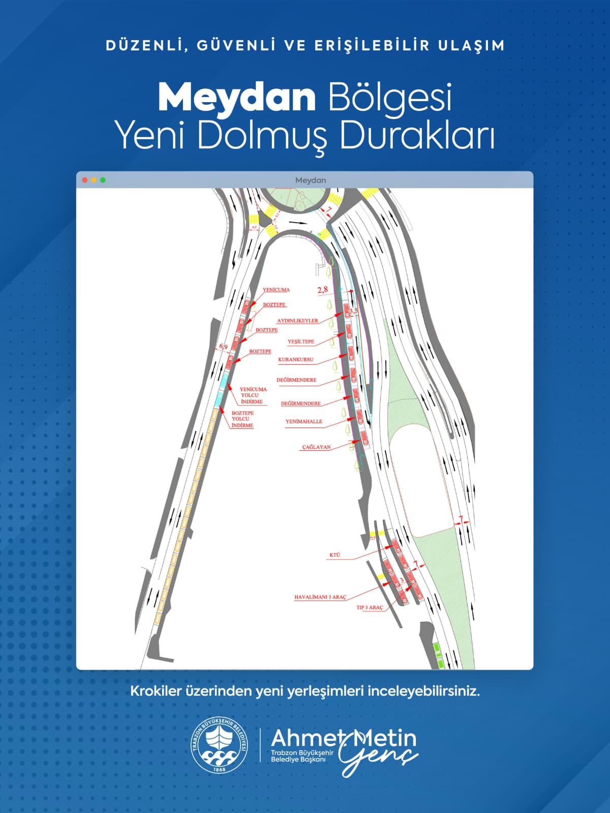 Yeni düzenleme kapsamında Meydan bölgesinde faaliyet gösteren Yenicuma, Boztepe, Aydınlıkevler, Yeşiltepe, Kuran Kursu, Değirmendere, Yenimahalle, Çağlayan, Karşıyaka, KTÜ, Havalimanı ve Tıp Fakültesi dolmuş hatları, eski Baro binası ile Fatih Parkı yanına konuşlandırıldı.