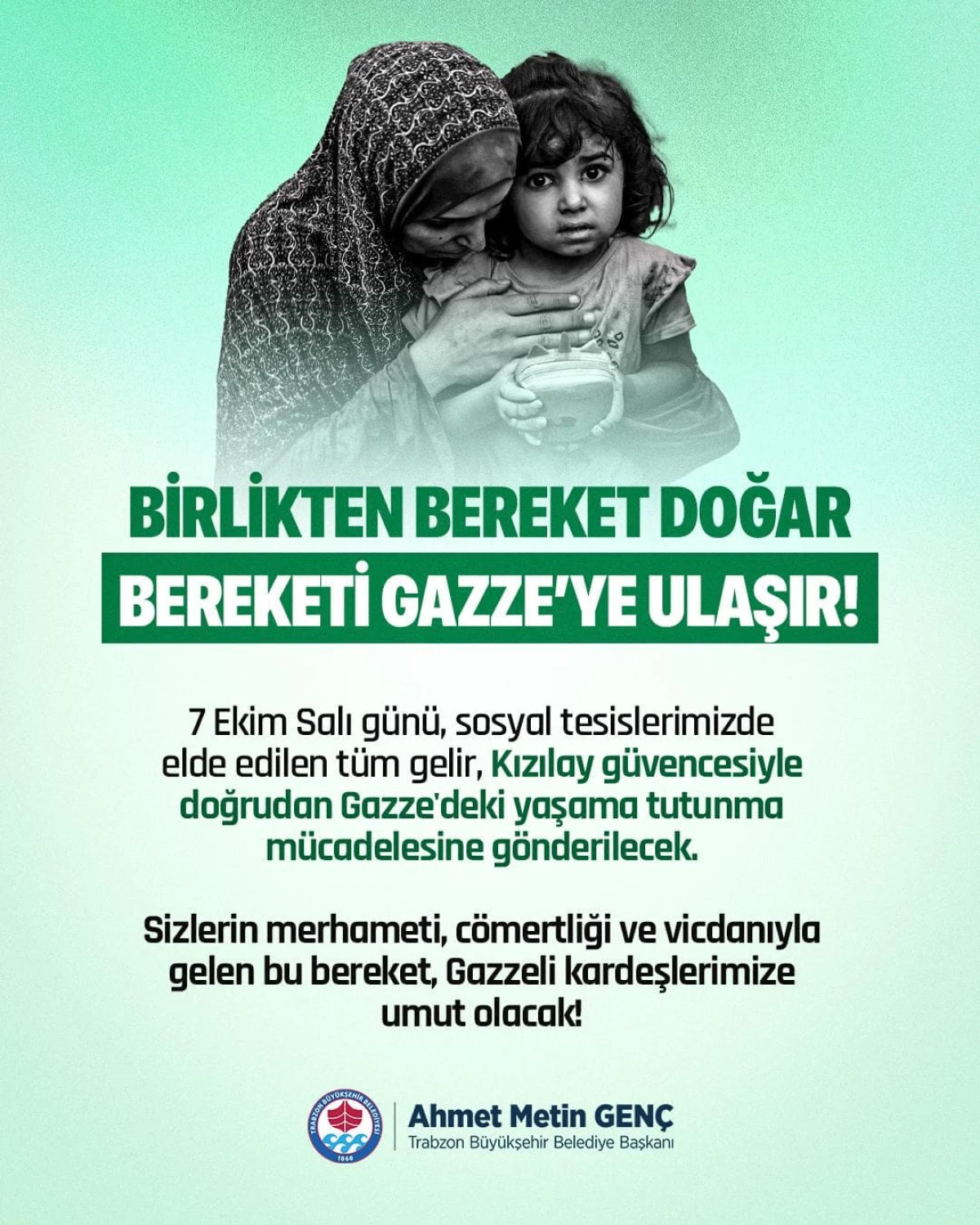 Trabzon Haber Merkezi | Trabzon Büyükşehir Belediyesi, Gazze halkına destek olmak için yeni bir kampanya başlattı. Belediyeye bağlı sosyal tesislerden elde edilecek gelirler, Kızılay aracılığıyla doğrudan ihtiyaç sahiplerine ulaştırılacak.