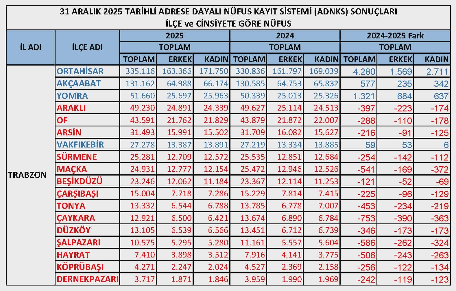 İl genelindeki 1.053 kişilik artışın büyük bölümü Ortahisar’dan geldi. Ortahisar’ın nüfusu 4.280 kişi artarak 335.116’ya yükseldi.