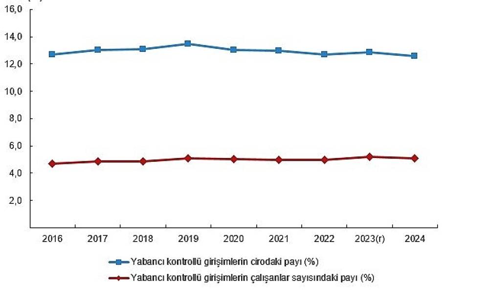 Yabancı kontrollü girişim istatistiklerine göre yabancı kontrolündeki girişim sayısı 2023 yılında 10 bin 673 ve 2024 yılında 11 bin 86 oldu. Bu girişimlerin toplam cirodaki payı 2023 yılında %12,9, 2024'te ise %12,6 oldu. Yabancı kontrollü girişimlerdeki çalışanlar sayısının toplam çalışanlar sayısı içinde payı 2023 yılında %5,2, 2024'te ise %5,1 oldu.
